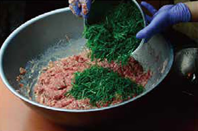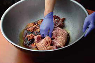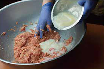 1日かけて炊いたスープを冷蔵庫で保管して次の日に新しいスープと大山鶏を足して丸2日かけて、上質な旨味とコクを含んだ秘伝のだしを作ります。それをカツオや昆布などから旨い成分を抽出した秘伝のタレとあわせて一晩寝かせたら、魂の宿った餃子の餡の完成です。